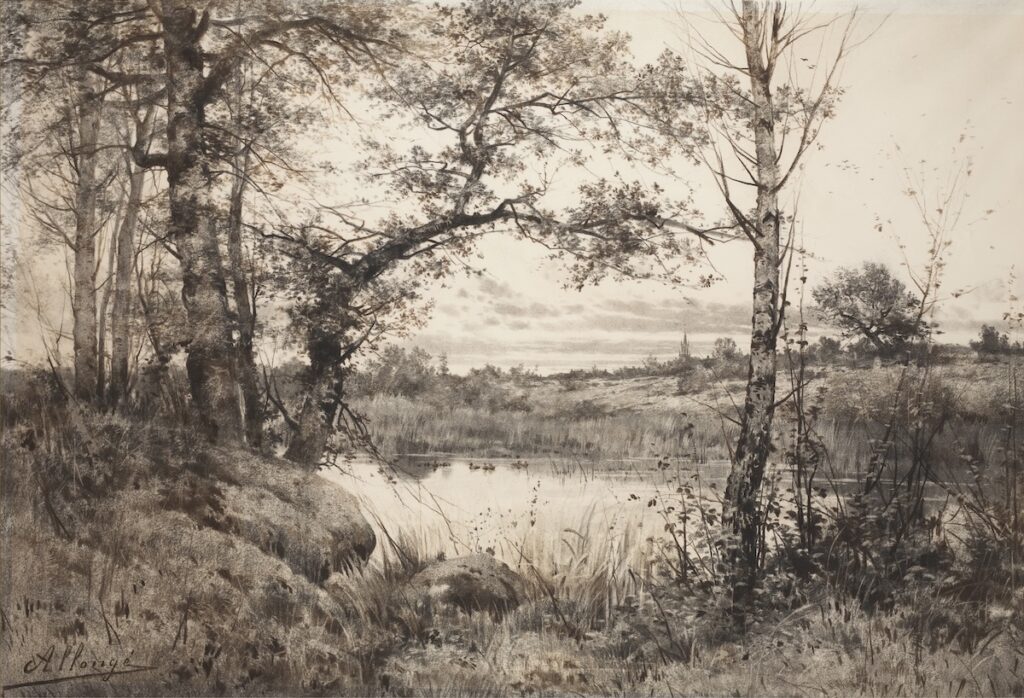 Maître du fusain et aquarelliste talentueux, Auguste Allongé (1833-1898) dessinait sur le motif de vastes paysages d’un réalisme franc et vigoureux. Son sujet de prédilection fut la forêt de Fontainebleau où il s’établit en 1876. Passionné par la technique du fusain, Allongé écrivit un traité intitulé « le Fusain » qu’il publia en 1873.