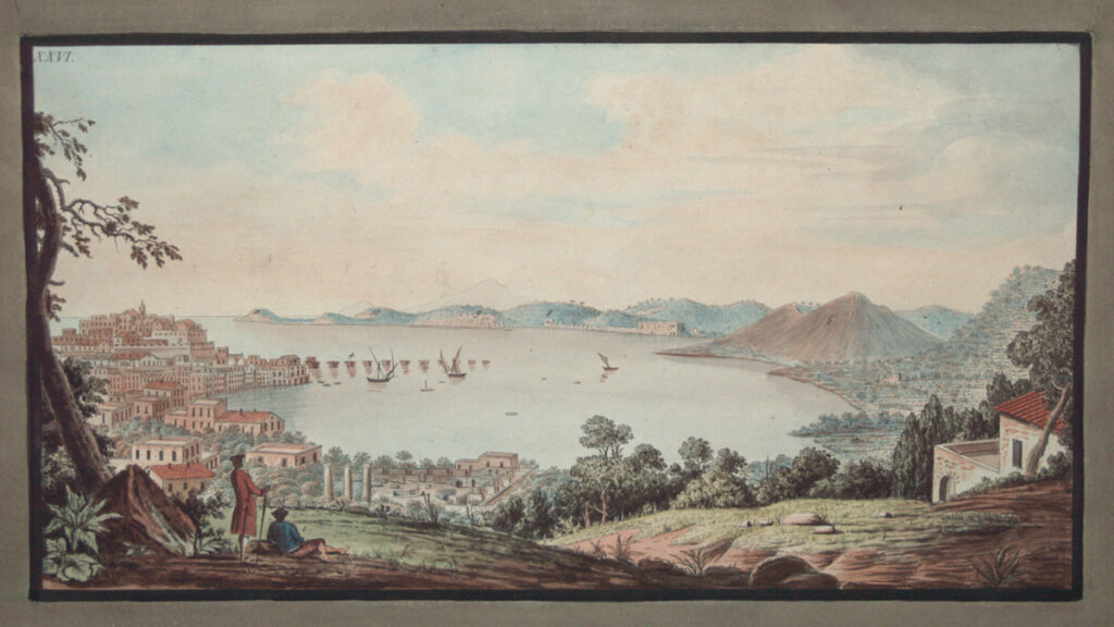 Une vue plongeante sur Pouzzoles et la mer, avec Sir William Hamilton et son artiste Pietro Fabris au premier plan, une planche tirée du célèbre ouvrage d’Hamilton sur les volcans italiens, les « Campi Phlegraei ». Hamilton fut « envoyé extraordinaire auprès du royaume des Deux-Siciles » à Naples de 1764 à 1800, période durant laquelle il publia des ouvrages sur ses deux sujets de prédilection, les vases classiques et la volcanologie. Lui, ainsi que Fabris visitèrent l’Etna et le Vésuve, risquant souvent leur vie pour consigner des événements de nature volcanique. Le livre qui en a résulté en 1776, le rarissime « Campi Phlegraei », doté d’un supplément paru en 1779, est considéré comme l’un des meilleurs livres illustrés en couleurs du XVIIIe siècle.